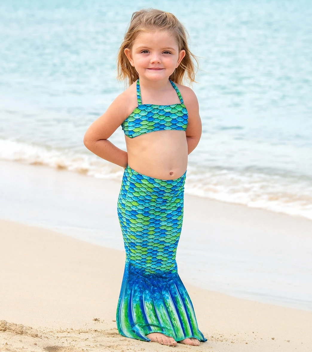 When your sweet toddler wants to be a mermaid, grant her wish with the Fin Fun Aussie Green Mermaid Tail Set (Toddler). This set features an open skirt design, so your little one can go in and out of the pool.