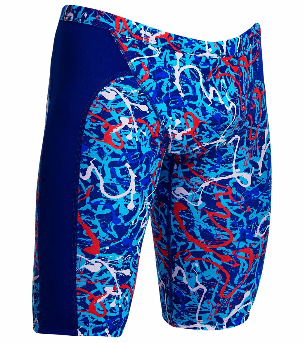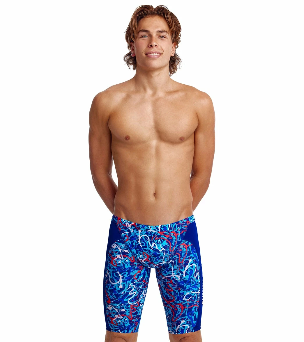 Train with flare and have fun in the Funky Trunks Men’s Mr Squiggle Jammer Swimsuit, featuring hip-to-knee coverage with contoured panelling, flatlock stitching, and front pouch lining.