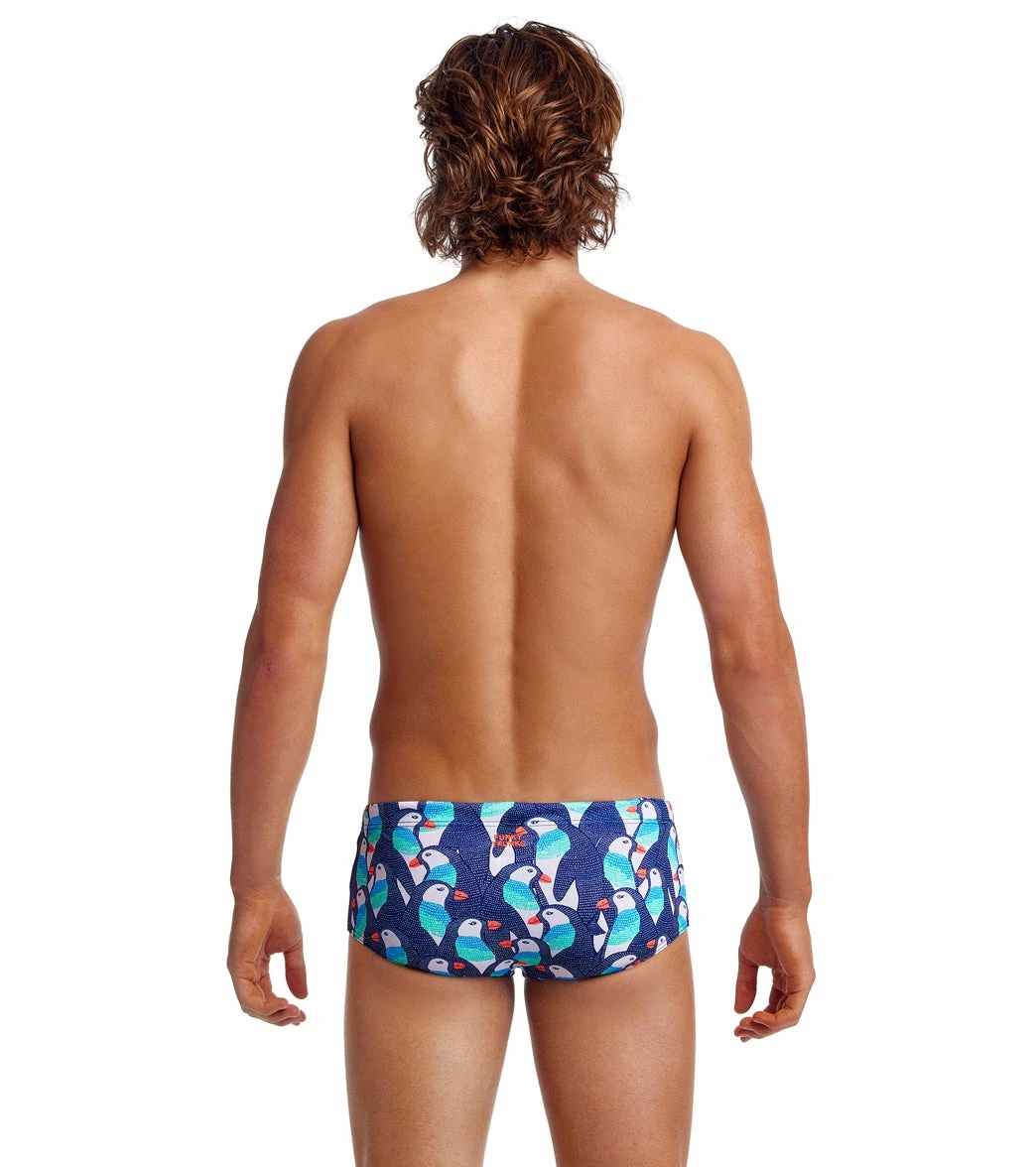 Rock a classic, pool-tested style with the Funky Trunks Men’s Pengoo Parade Sidewinder Square Leg Swimsuit, featuring 5.5 inches of coverage on your hips and a lined front panel.