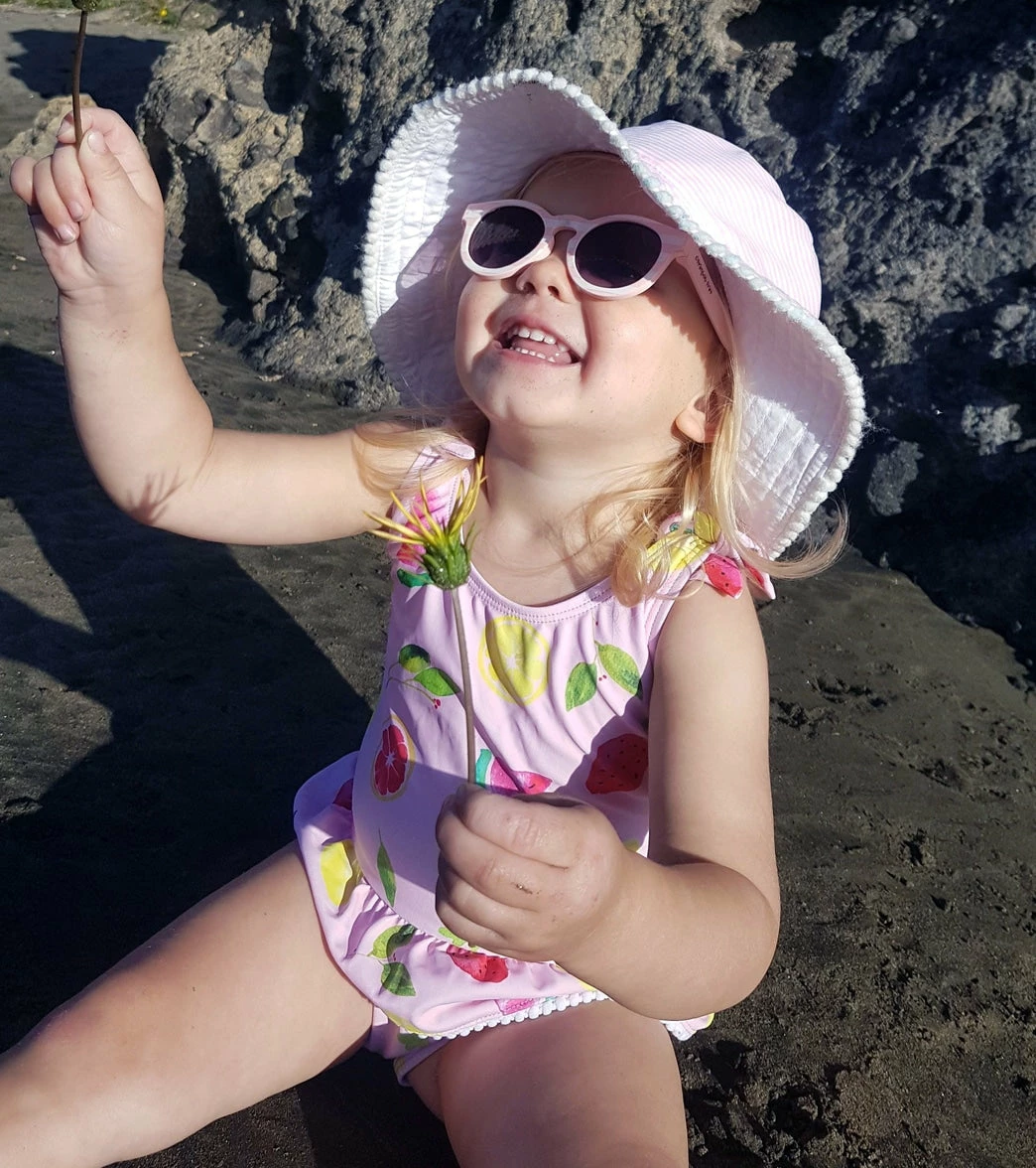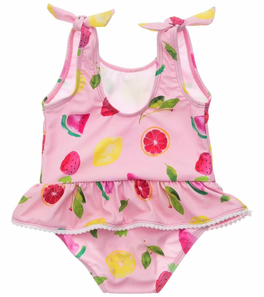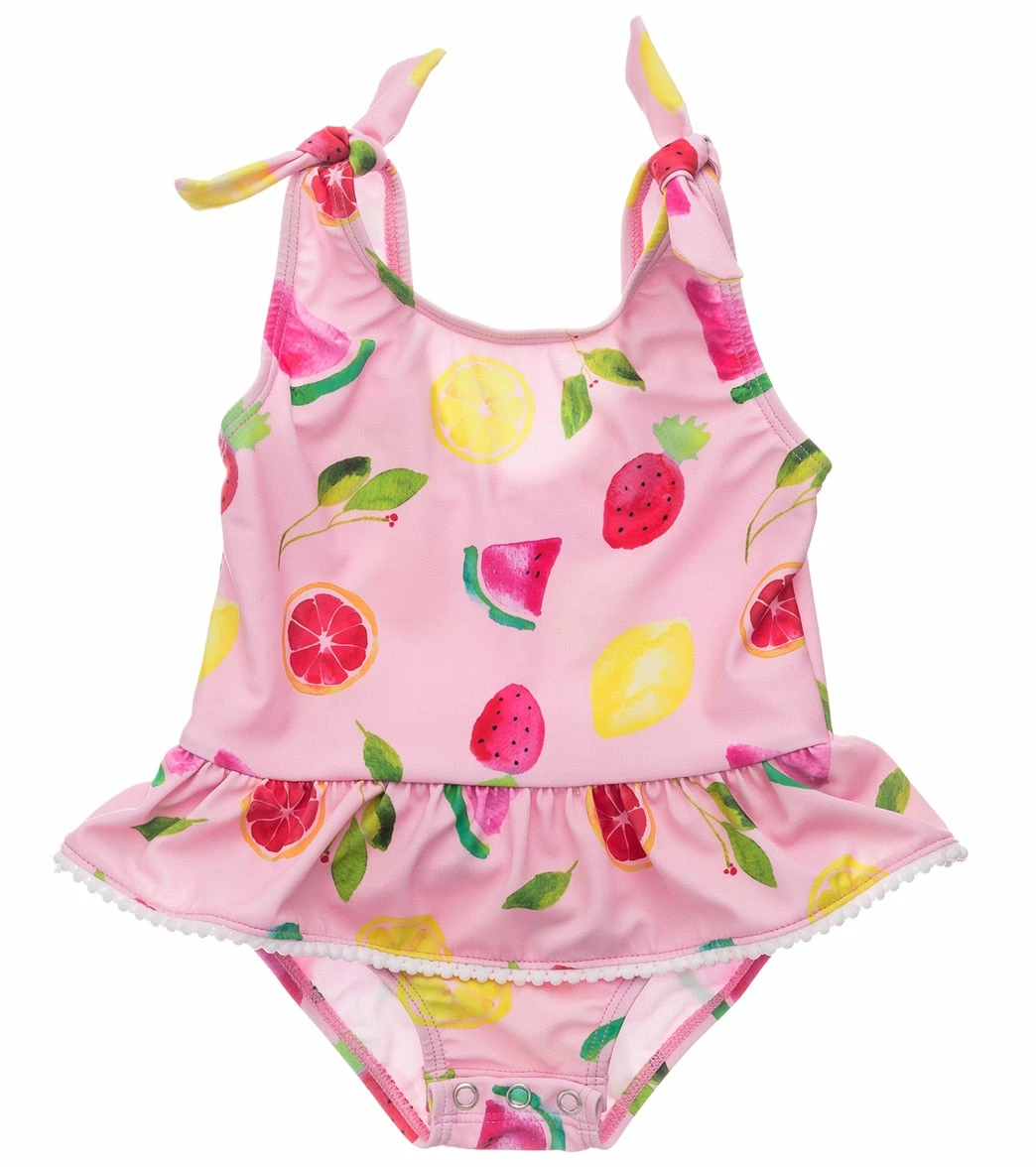 Dress your child for a fun day at the beach in the Snapper Rock Girls’ Fruit Fiesta One Piece Skirt Swimsuit.