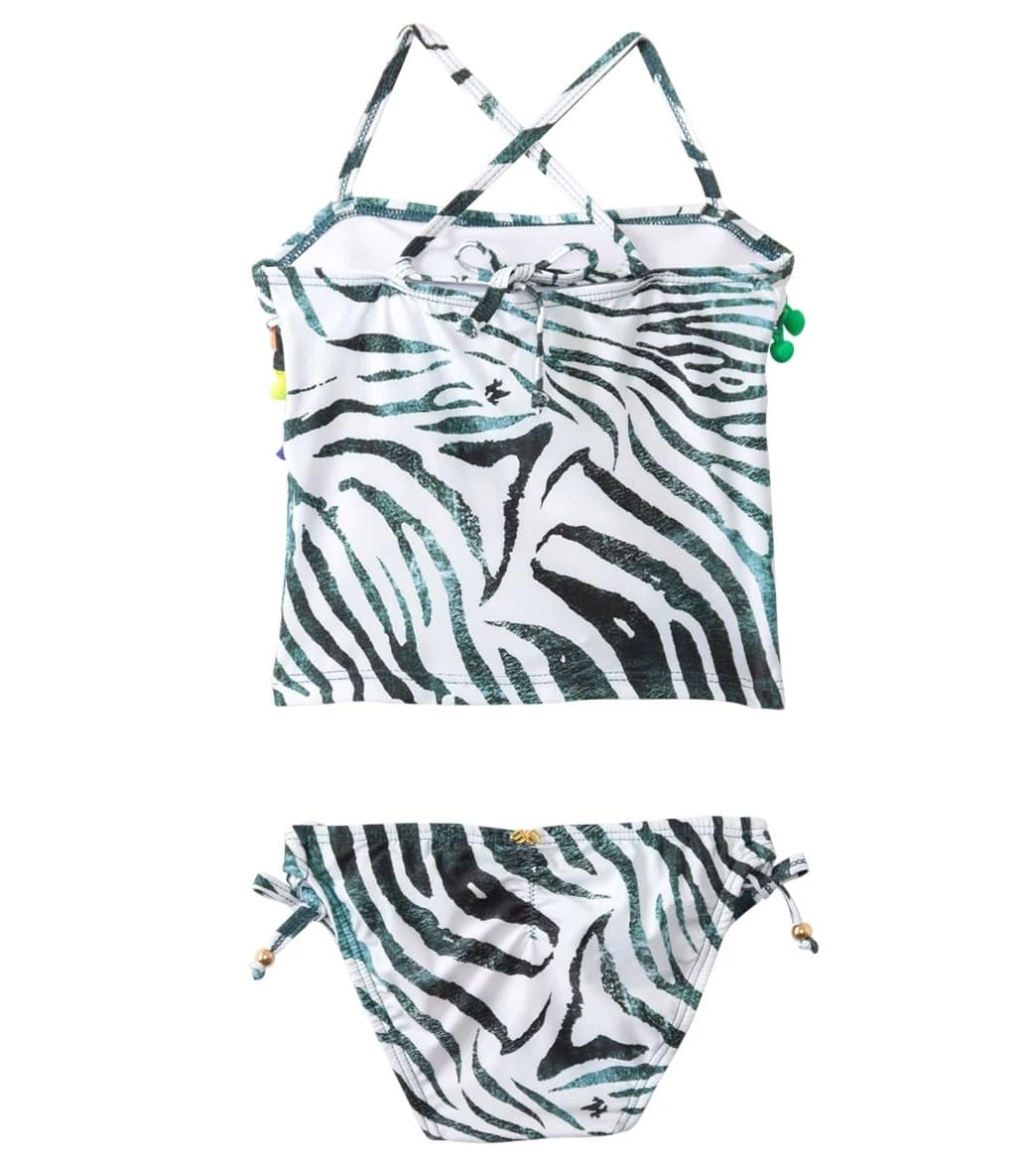 Add some color and rainbows to her wardrobe with the PilyQ Girls’ Tanzania Pom Pom Ruffle Tankini Set. This vibrant, bold swim set features a playful design with crisscrossed shoulder straps for a cute look and all-day comfort.