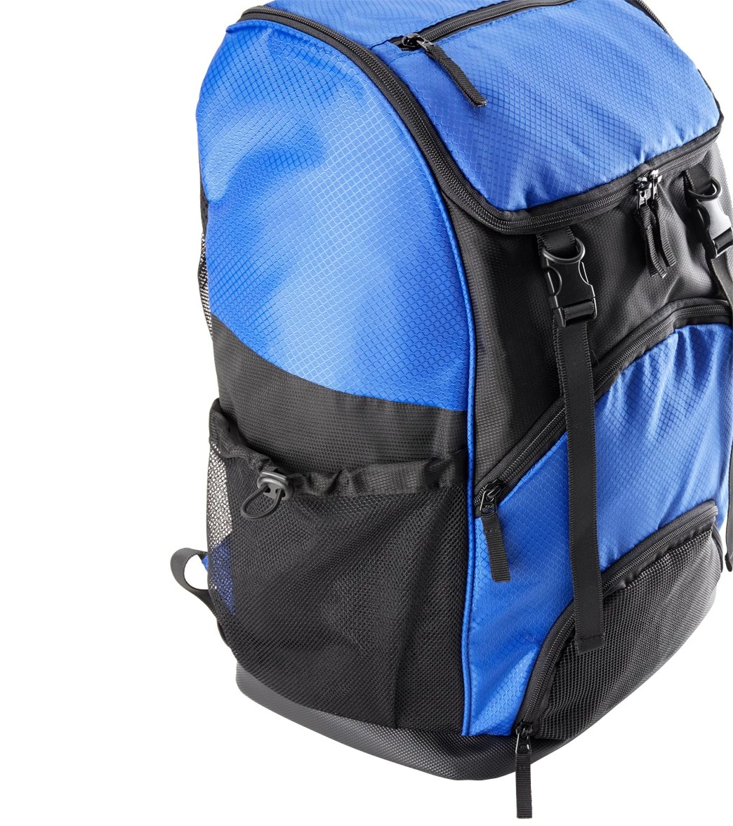 Pack up your competition essentials with the Sporti Large Athletic Backpack. Covered with handy compartments like large mesh side pockets and a removable inner dirt back, this backpack has padded straps and a durable waterproof base, making it perfect for the traveling swimmer.