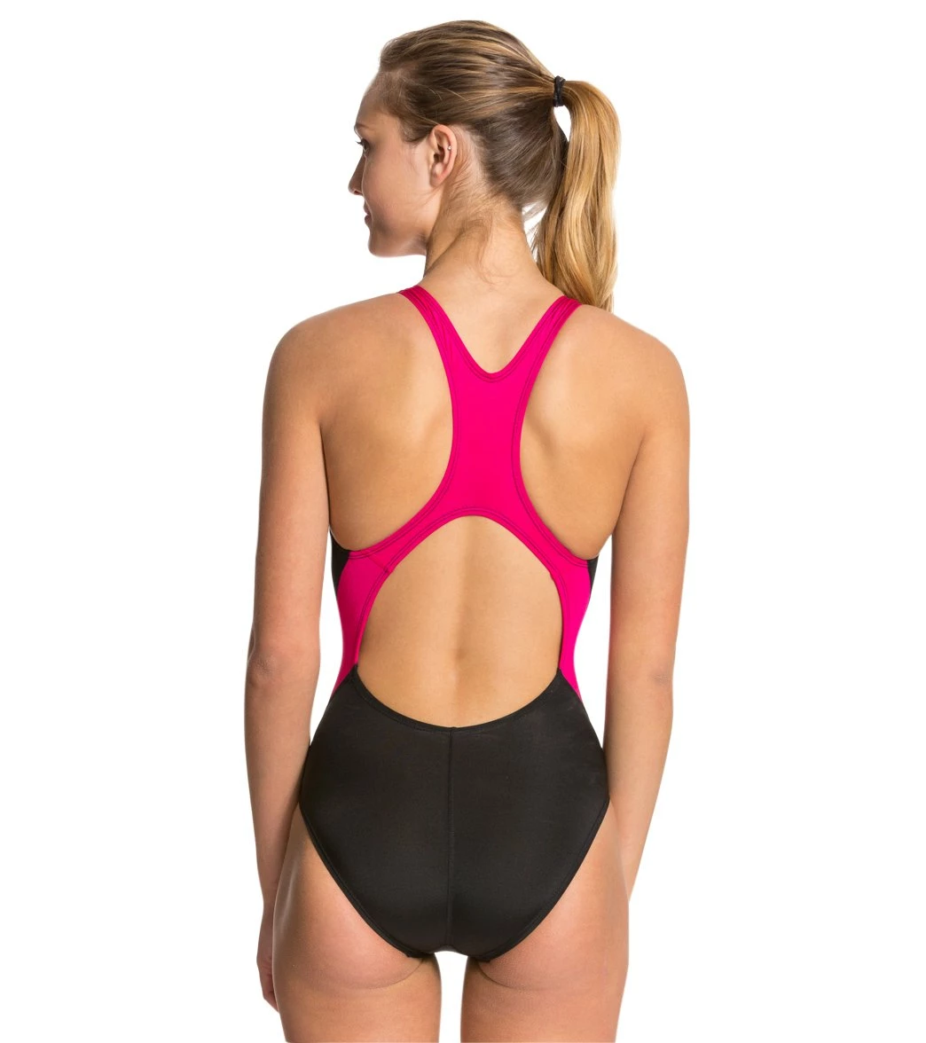 The Ocean Racing by Dolfin Color Block Performance Back One Piece Swimsuit is made out of durable nylon fabric that can withstand the toughest of racing conditions.